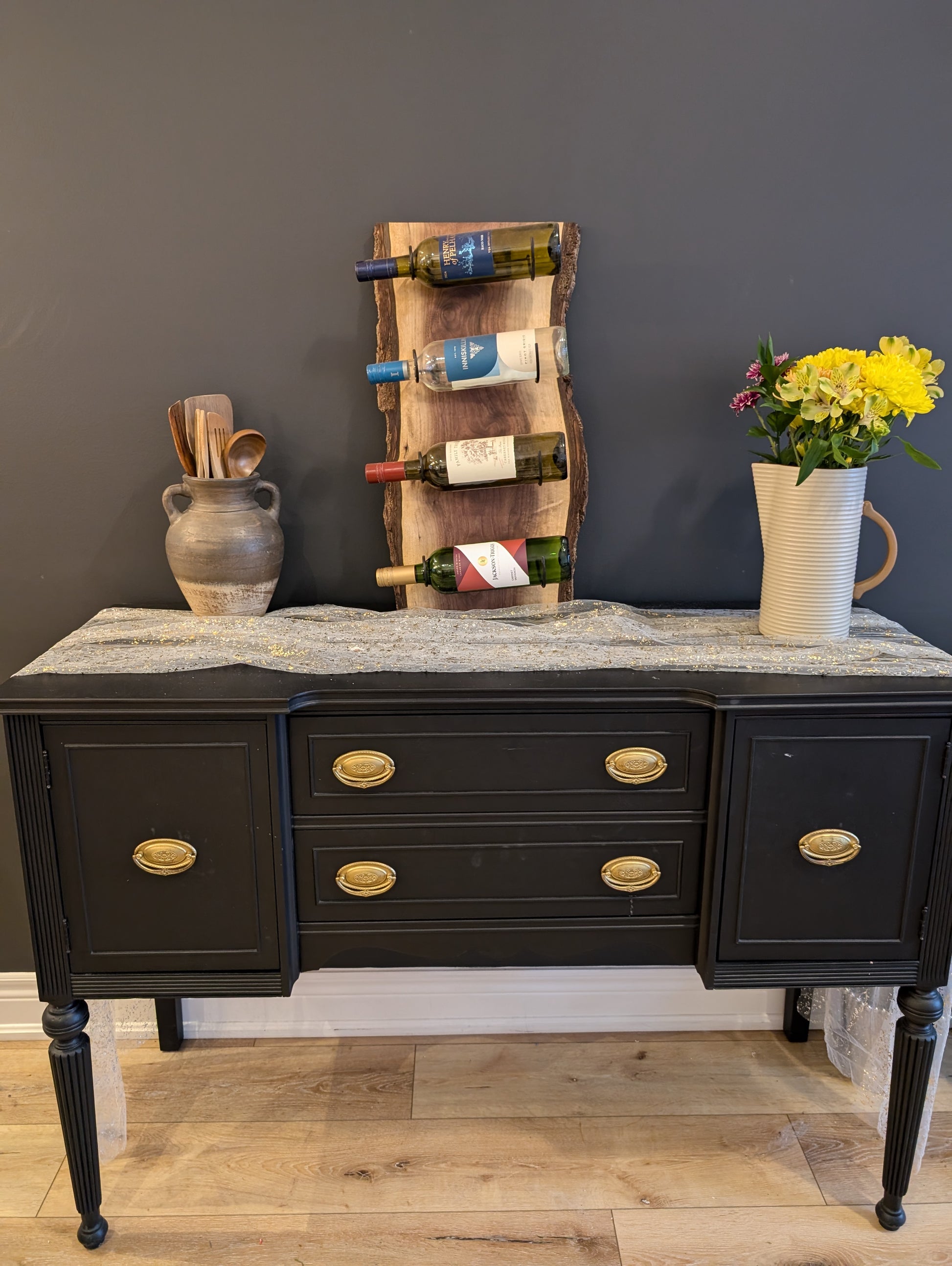 Handmade live edge black walnut wine rack. 24 inches tall and 12-14 inches wide. Holds 4 bottles of wine and can be leaned against a wall/cupboard or hung using the included flush mounts. Custom orders available.